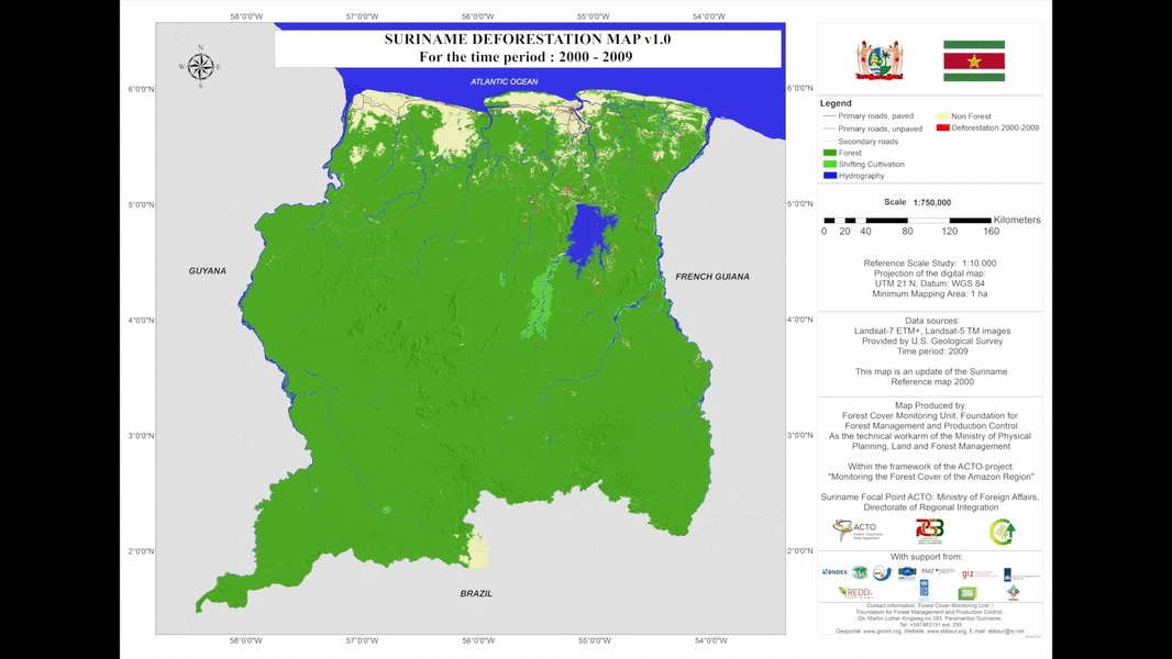 Wereldwijd is Suriname een van de landen die zich een High Forest Cover Low Deforestation (HFLD) land mag noemen oftewel een land met een hoge bosbedekking en lage ontbossingsgraad. Ondanks dit, heeft Suriname zijn eigen uitdagingen om de hoge bosbedekking te kunnen behouden. Het is daarom erg belangrijk om een nationaal bos monitoring systeem te ontwikkelen, zodat onder andere de veranderingen van de bosbedekking gemonitord kunnen worden. Binnen dit systeem zijn er een aantal kaarten geproduceerd, die een overzicht geven van de ontbossingsgebieden, die vanaf het jaar 2000 zijn ontstaan. De Stichting voor Bosbeheer en Bostoezicht is de technische partner binnen het REDD+ programma, die verantwoordelijk is voor het ontwikkelen van het Nationaal Bosmonitoringsysteem.