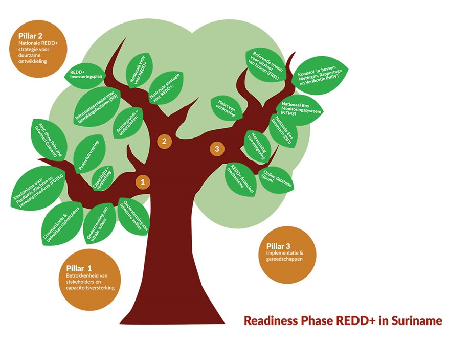 Het nationaal REDD+ programma in Suriname is georganiseerd rondom drie hoofdpilaren, dit zijn: